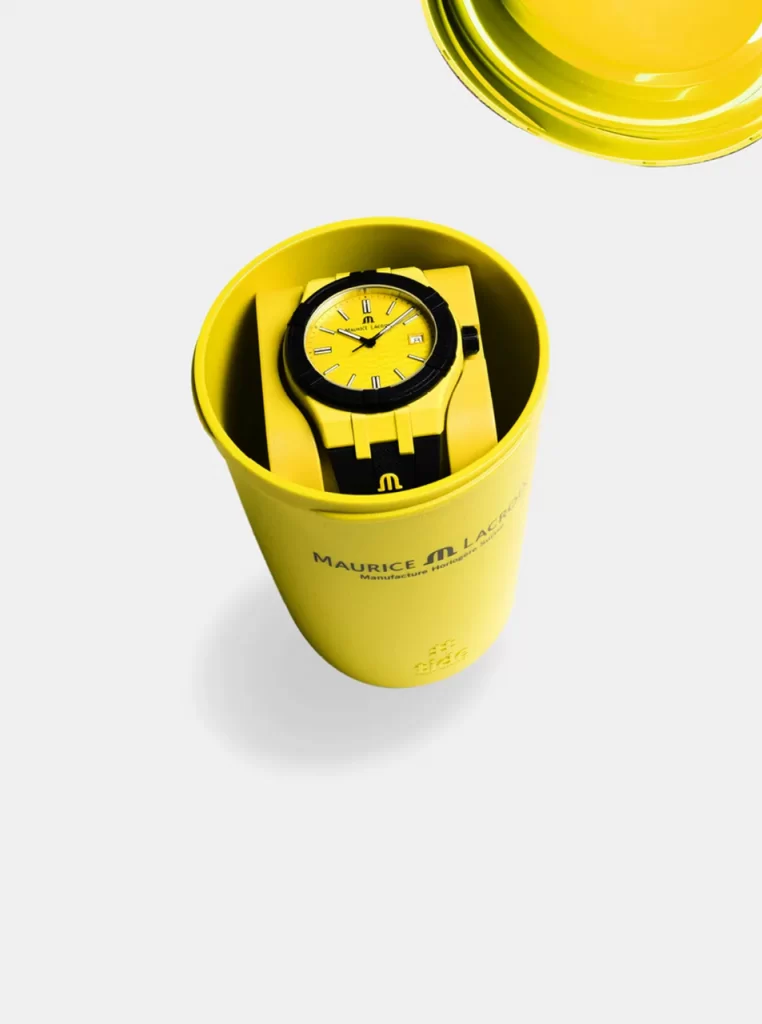 La lunetta, la cassa, il fondello, la corona, il terminale e la fibbia sono tutti realizzati in questo materiale composito.Occorrono 17 bottiglie per realizzare un orologio e la sua confezione su misura, il che significa 17 bottiglie in meno che inquinano l’oceano.
