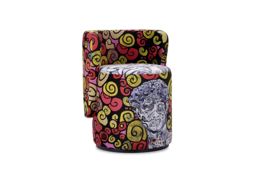La poltronaBoll, del designer Simone Micheli, ospita invece la Venere del Botticelli o il David di Michelangelo. I disegni reinterpretati da Le Clochart sono stati fedelmente trasportati su tessuto e rivestono le forme rotondeggianti della seduta che aggiunge alla sua funzione originaria quella di opera d’arte capace di animare ogni ambiente.