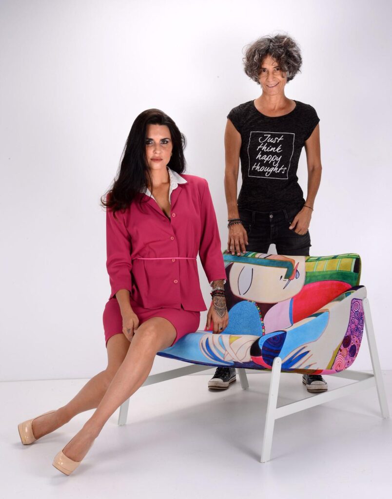 La poltrona Hammock, disegnata da Debonademeo, con le sue linee minimaliste e irregolari, accoglie un Modigliani nell’interpretazione audace e dalle forti cromie tipica delle due artiste.