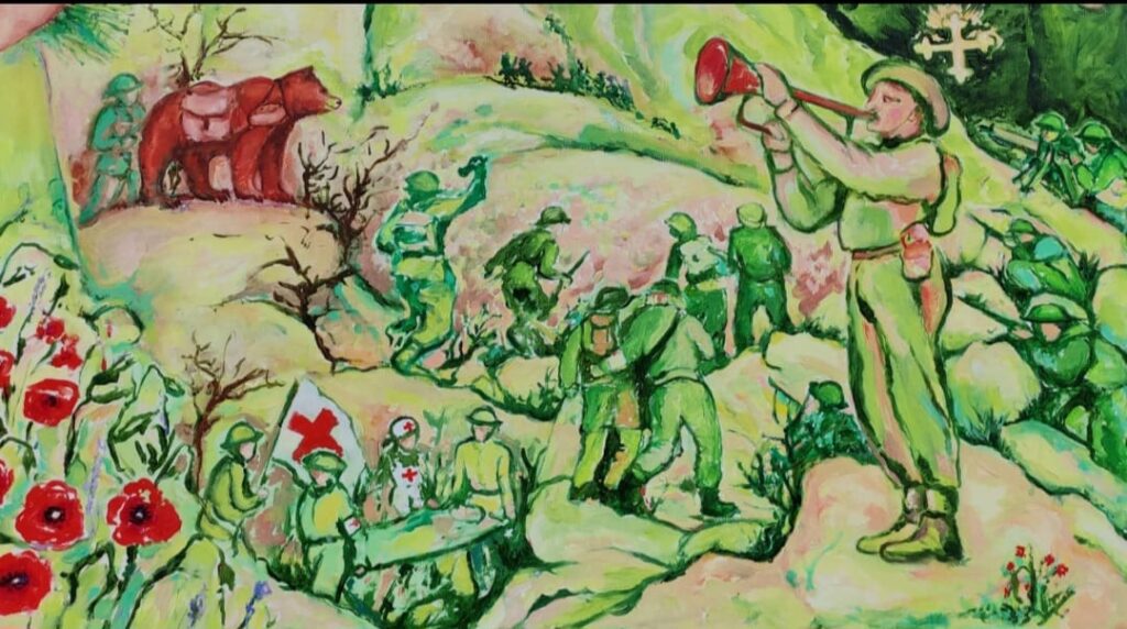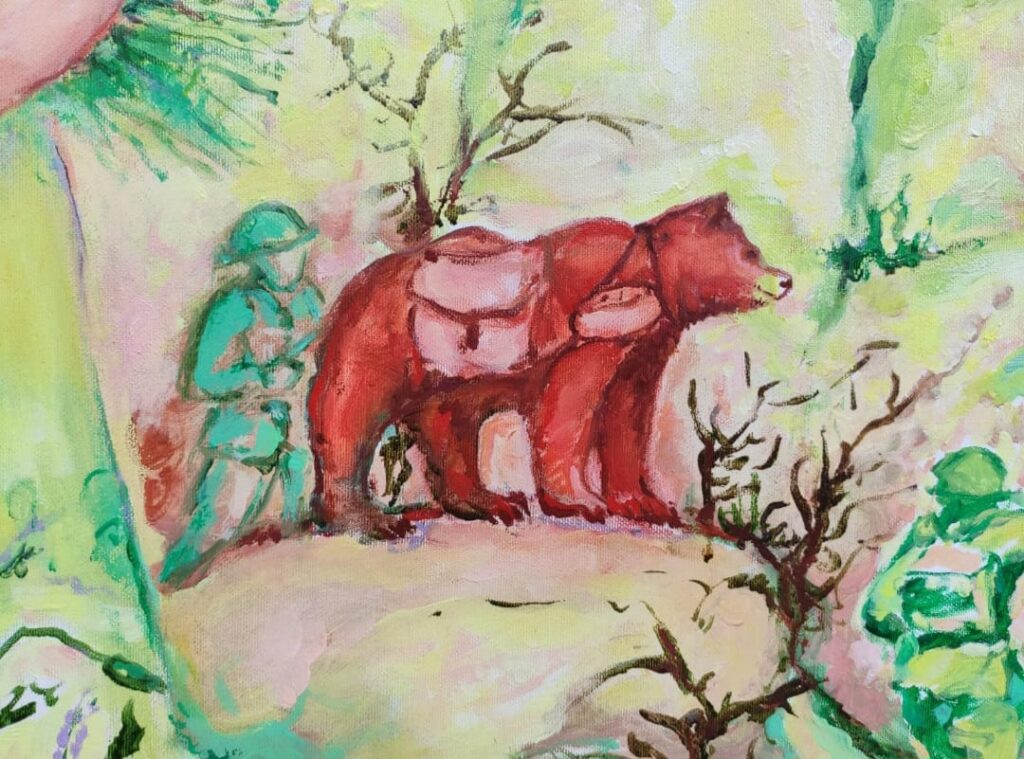 A prima vista potrebbe essere interpretato come uno di quegli elementi di natura onirico-fantastica che si riscontrano, quasi sempre, nelle opere di HALINA, e che testimoniano della formazione “chagalliana” dell’Artista. In realtà, anche se ella riesce comunque a imprimere nella rappresentazione un che di favoloso e fiabesco, si tratta di un riferimento storico a un orso in carne e ossa, divenuto tuttavia in qualche modo leggendario: l’orso bruno-soldato Wojtek (“il guerriero sorridente”; 1942-1963), arruolato nella 22ma Compagnia addetta al munizionamento e alla logistica per l’artiglieria.