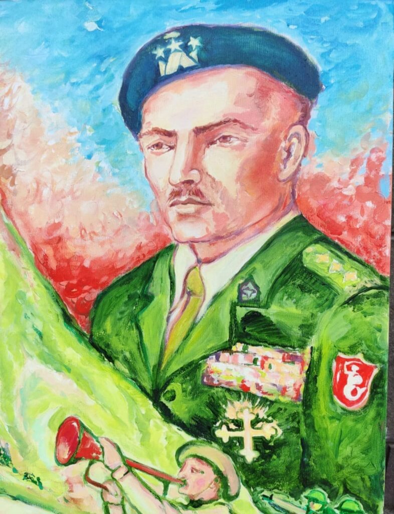 A destra in alto si staglia monumentale il ritratto del generale comandante, con le sue medaglie, i nastrini e le decorazioni. Il volto, intelligente e fiero, esprime con il suo sguardo fermezza, determinazione e coraggio uniti ad un’affabile umanità ed esso sembra volgersi in direzione della sua giovane e bionda compagna di vita, la moglie Irena, il cui bellissimo ritratto è realizzato sul lato opposto. I due sembrano essere insieme separati e collegati dalla stessa altura dell’Abbazia, come essa rappresentasse un passaggio obbligato del destino.
