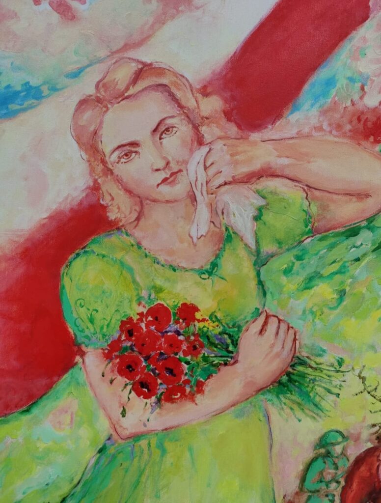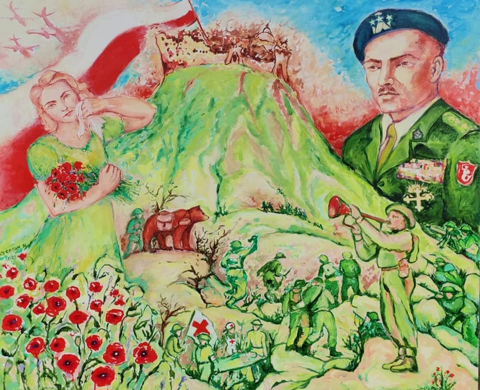 3. Come già si è detto dianzi, sul lato opposto rispetto al ritratto a mezzo busto del Generale, che torreggia sulla destra della tela rispetto al riguardante, HALINA ha realizzato uno splendido ritratto in tre quarti della moglie di Wladyslaw, IRENA ANDERS (1920-2010). Ella stringe un mazzo di papaveri rossi, rappresentazione che ha al tempo stesso una dimensione che si dispiega sul piano storico ed un’altra che travalica verso un piano profondamente simbolico. Va ricordato che il colle dell’Abbazia con la primavera si ricoprì di un rosso manto di papaveri, e quel rosso divenne il simbolo del sangue versato dai soldati polacchi in nome di quell’ardua impresa. IRENA recitava e cantava nel Teatro militare al séguito delle truppe e divenne famosa, e a tutt’oggi lo è, la canzone che fu composta ad hoc e che ella cantò in quell’occasione: Czerwone maki na Monte Cassino (“Papaveri rossi su Montecassino”). Il bouquet di Irena rimanda ai papaveri rappresentati in basso a sinistra e contribuendo, ancora una volta, a determinare un’immagine ambivalente di idilliaca e quasi paradisiaca ambientazione ma che, al tempo stesso rimanda all’inferno della durissima battaglia svoltasi. In basso si affaccendano soldati polacchi, anch’essi in divisa verde tattico, impegnati in attività varie, fra cui si distinguono, in basso a sinistra, gli addetti al soccorso medico-sanitario (oltre ai caduti si contarono ben 2931 feriti) e, sulla destra, in primo piano remoto, un trombettiere. Ma ciò che più attirerà l’attenzione del riguardante sarà molto probabilmente il plantigrado che si osserva su una rupe a mezza altezza nella zona sinistra della rappresentazione.