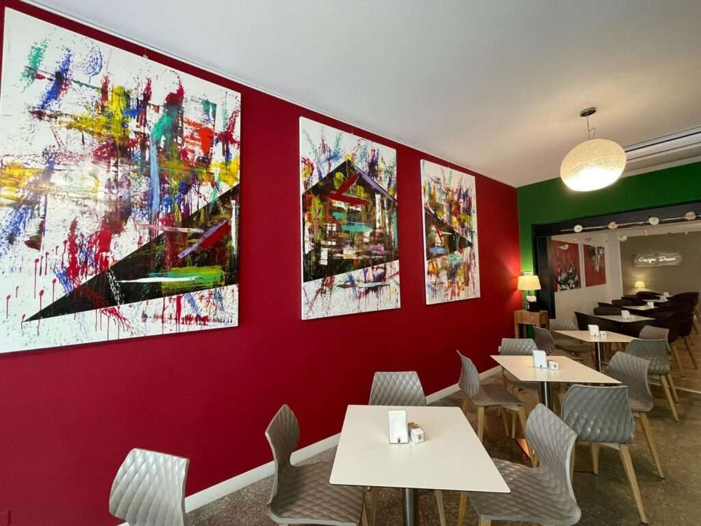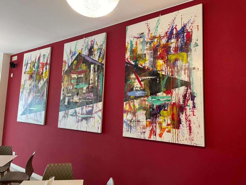 Ha esposto con successo in diversi Locali che le hanno dedicato intere pareti e ha realizzato in partnership con Macino Food and counseling una confezione d’artista.