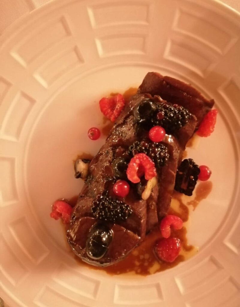 Nel primo menu ci ha incuriosito in particolare il capriolo, frutti di bosco e bieta o l’anatra, mandorla e pan pepato; del secondo il tortello coniglio e zabaione e il branzino, aglione e capperi.