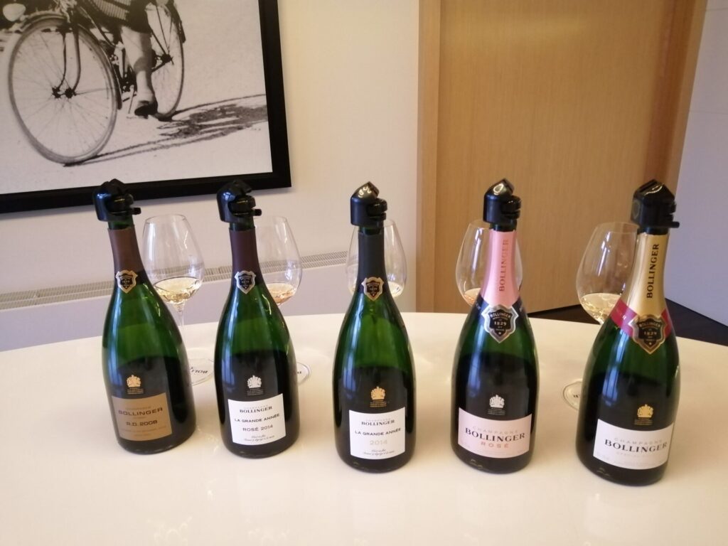 Tutto comincia dalla Côte aux enfants la zona migliore per il Pinot Noir, cosiddetta perché molto scoscesa e si diceva che solo i bambini sarebbero stati tanto agili e capaci di poterci arrivare e lavorare ma è una leggenda metropolitana. Nel 1941 Jacques Bollinger muore senza eredi ma sua moglie Élisabeth Bollinger prende le redini con grande capacità, una delle prime donne in Champagne a fare la promozione di un vino fuori della Francia. Tuttora l’azienda Bollinger è detenuta al 100% dalla famiglia anche se nel 2007 è stato nominato un Direttore generale che non fa parte della famiglia. Cinque i pilastri su cui si regge la filosofia dell’azienda, rispettivamente il vigneto – con i 180 ettari nella Valle della Marne con i Grands-Crus e i Premiers-Crus al 60% Pinot Noir, per il 25% Chardonnay e per il restante 15% il Meunier -; la centralità del Pinot Nero presente in tutte le cuvées, anche in parte minima; la specialità dei vini di riserva in formato Magnum; le botti in legno di castagno francese con un fatto unico nella zona, una propria azienda produttrice; e il tempo, quale valore per impreziosire il vino, con un invecchiamento più lungo del minimo richiesto dal disciplinare che va per Bollinger da un mino di 3 anni per i non millesimati a un minimo di 7 per i millesimati.