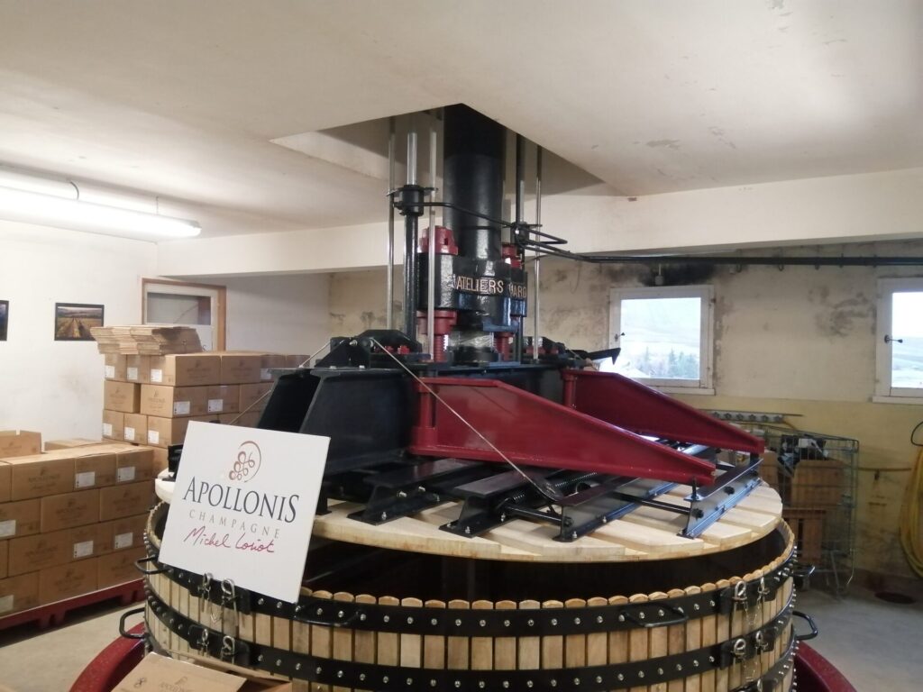Nella stanza della memoria dove si può leggere la storia della famiglia la grande pressa del 1903, la prima a Festigny che sostituì l’abitudine contadina di mettere i grappoli nei panieri di vimini dove spesso l’uva di rovinava. È però solo dal 1930 che Germain Loriot, nonno di Michel, comincia la produzione delle prime bottiglie mentre prima in Champagne si vendeva ai Négociant mosto, vino o direttamente l’uva. Sono gli anni in cui si comincia la formazione per gli adulti in materia di viticoltura.