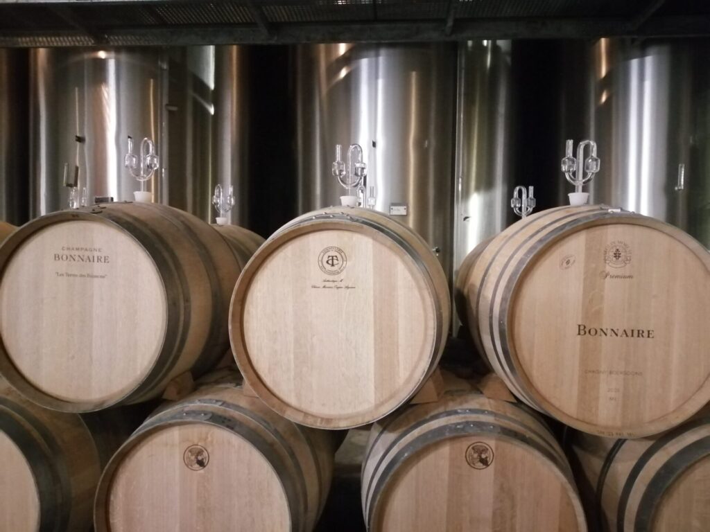 Le botti provengono dall’azienda di cui è proprietaria in Borgogna e sono utilizzate sia per la fermentazione alcolica sia per la malolattica allo scopo di ottenere un ventaglio aromatico molto articolato; mentre il castagno è di un bosco sempre di proprietà di Bollinger che è conosciuta come la più piccola delle grandi Maisons della Champagne con i vigneti più estesi. Le cantine offrono un viaggio nel tempo legato anche ad un artigianato artistico come cerchi di legno più leggero che fasciano le botti perché rivelatori dell’eventuale presenza di insetti.