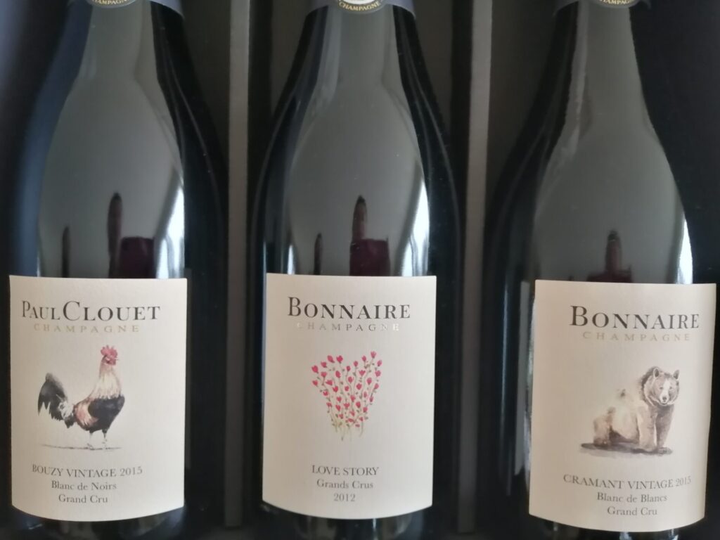 Le stesse etichette sono un modo per comunicare la filosofia della nuova generazione, realizzate da un artista bretone, Jules Maillard, con disegni che rendono l’abito dello Champagne leggero e moderno. L’Orso rappresenta ad esempio il villaggio di Cramant e il Gallo, simbolo francese tradizionale, Cramant; e ancora il vino Le Bateau, la barca, ha nell’etichetta l’immagine perché prodotto in una conca che ricorda un’imbarcazione. Infine, il cuore con i grappoli d’uva, “Love Story” è il nome del vino simbolo dell’unione dei due marchi realizzato al 50% con Pinot Noir e Chardonnay. Interessante alla degustazione il parallelo che si può fare tra i due marchi dove la differenza è una nuance, l’interpretazione che il diverso vitigno offre dello stesso tipo di prodotto