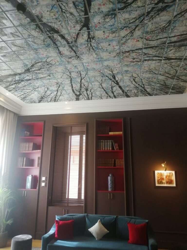 Sul soffitto di un corridoio un’installazione di 16 opere che rappresentano 16 paesi con un senso di corrispondenza: così ad esempio la farfalla gialla in Spagna e quella blu per il Portogallo. Tra l’altro questo lavoro è costituito da pannelli con la funzione di rendere facilmente accessibile il corridoio di servizi sovrastante.