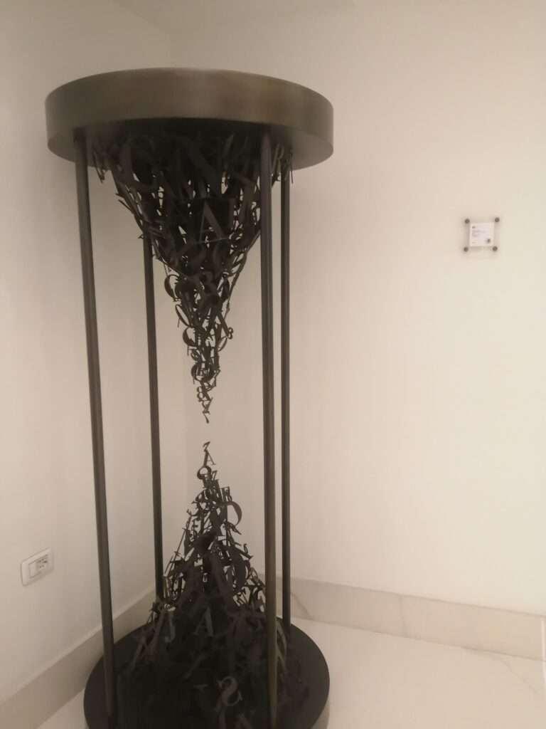 Il sodalizio con la Galleria Russo, ci ha raccontato Fabrizio Russo, è nato da un incontro fortuito, quando i signori Curatella entrati in Galleria rimasero affascinati dalle opere e proposero una collaborazione, raccolta come una scommessa. “Dopo il sopralluogo, ci ha raccontato Russo, ho fatto un appello agli artisti con i quali lavoriamo, promuovendo una serie di incontri in loco per realizzare opere site specific che in alcuni casi, come per i lavori di Enrico Benetta di Montebelluna in provincia di Treviso, classe 1977, artista diplomatosi nel 2001 in Decorazione presso l’Accademia di Belle Arti di Venezia, presente in modo significativo nell’hotel ha escogitato soluzioni in dialogo con l’architettura. La sua cifra che diventa quasi una firma sono i caratteri di stampa, in particolare le lettere dell’alfabeto in Bodoni.