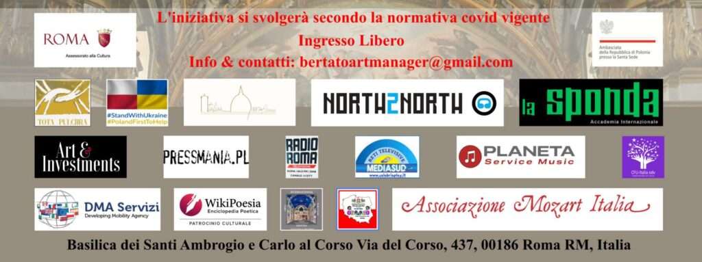 Si ringrazia per il patrocinio: l’Assessorato alla Cultura del Comune di Roma, l’Ambasciata Polacca presso Santa Sede, Tota Pulchra, Italian Opera Florence, Accademia La Sponda.
