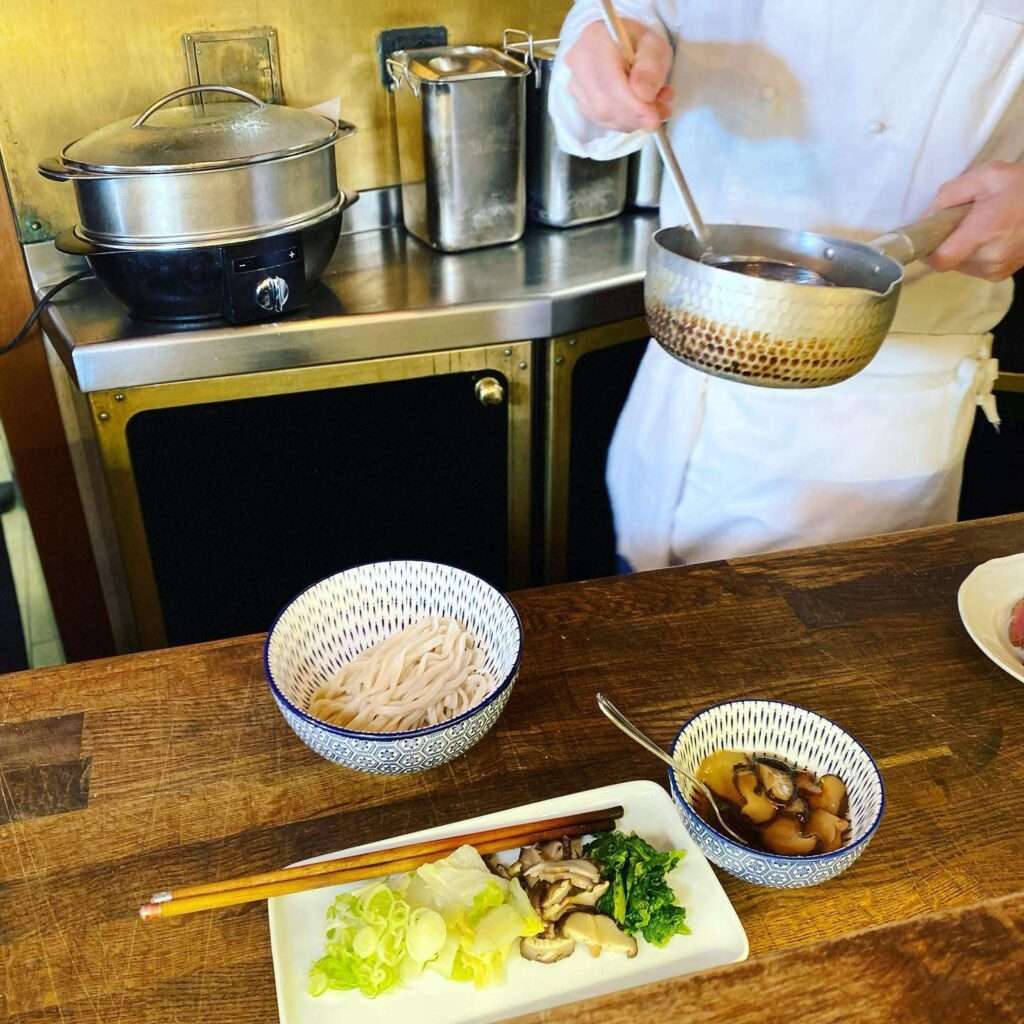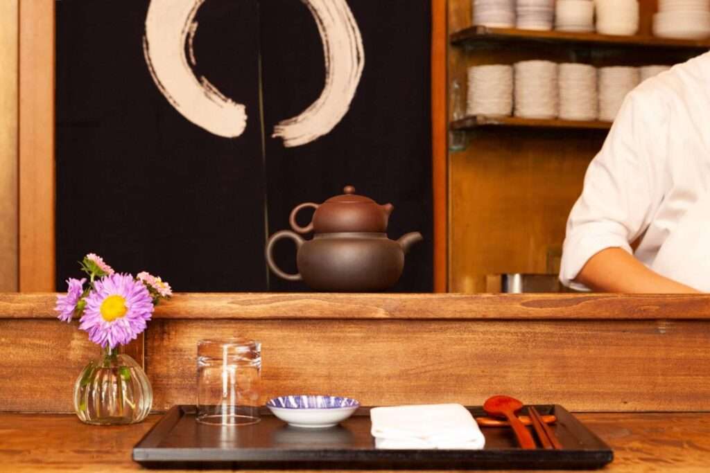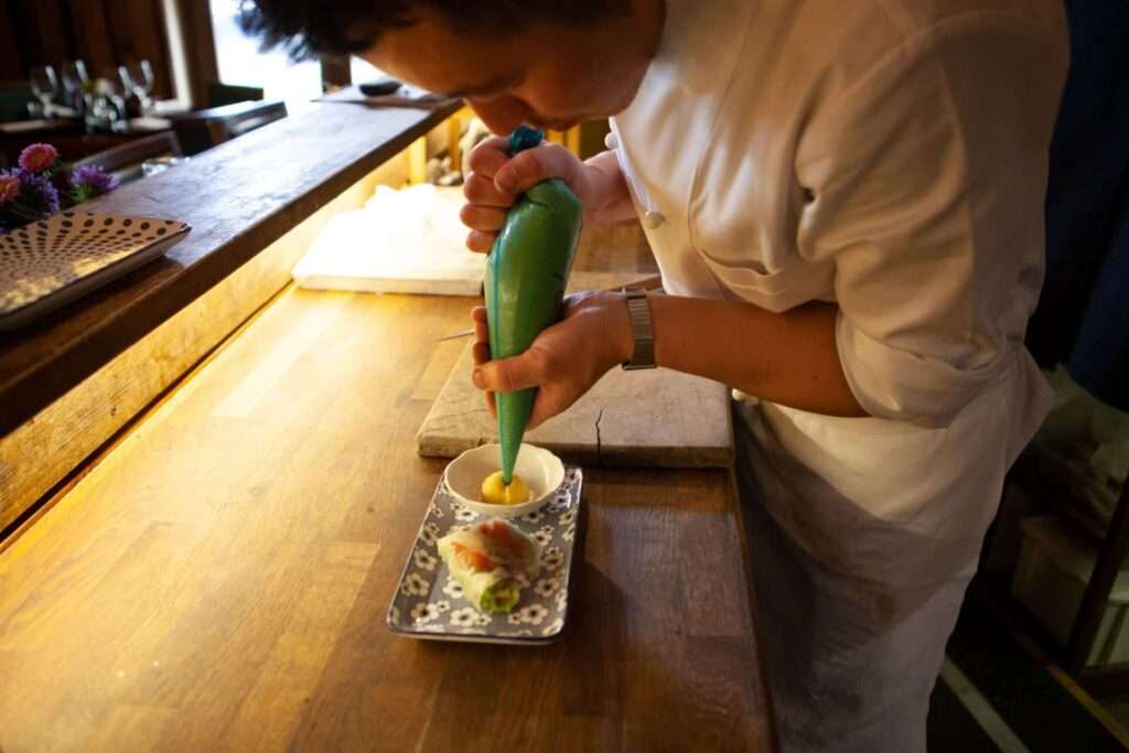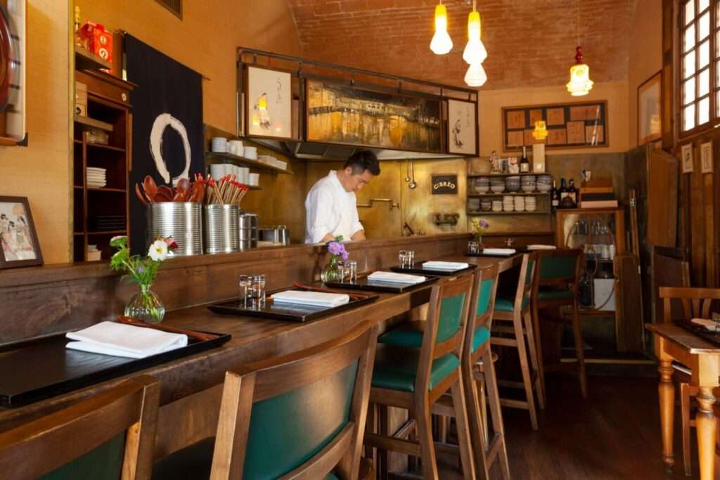 Un posto piccolo – una trentina di posti tra interno e dehors, circa 40 persone al giorno – come sono i ristoranti tipici in Giappone dove vecchie porte recuperate diventano la boiserie; un bancone con 8 posti per gli spettatori della cucina, molto artigianale, che dialoga con chi degusta. Tutto è essenziale e caldo, lontano da quell’immaginario europeo del ristorante giapponese.
