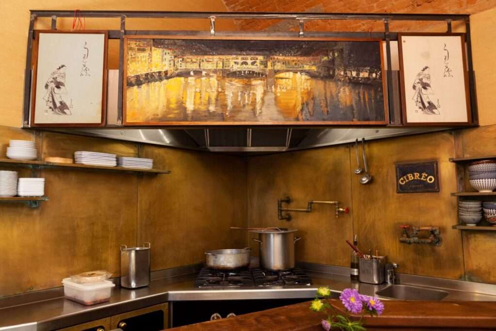 La proposta è una cucina che scalda il cuore, un’emozione domestica senza fuochi d’artifici, un viaggio lontano senza perdere le radici. Il quadro di Giulio Picchi, artista che recentemente ha ricominciato a disegnare, con il Ponte Vecchio davanti al bancone ce lo ricorda.